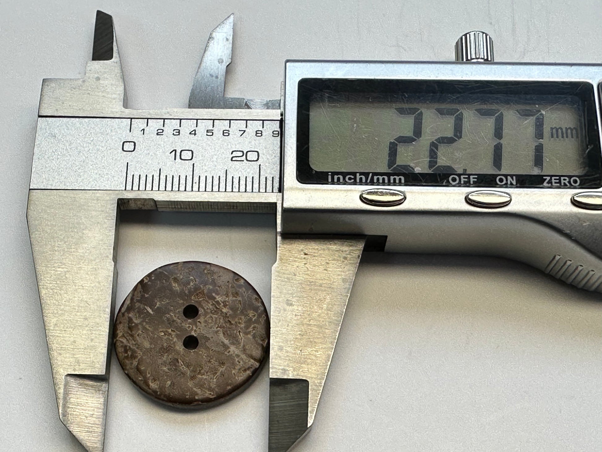 This beautiful 23mm coconut shell button features a natural brown tone with subtle marbling and organic surface detail that highlights the character of the shell. Each button has a smooth sew-through design and a natural finish, giving it a warm, tactile look that pairs beautifully with natural fibres.