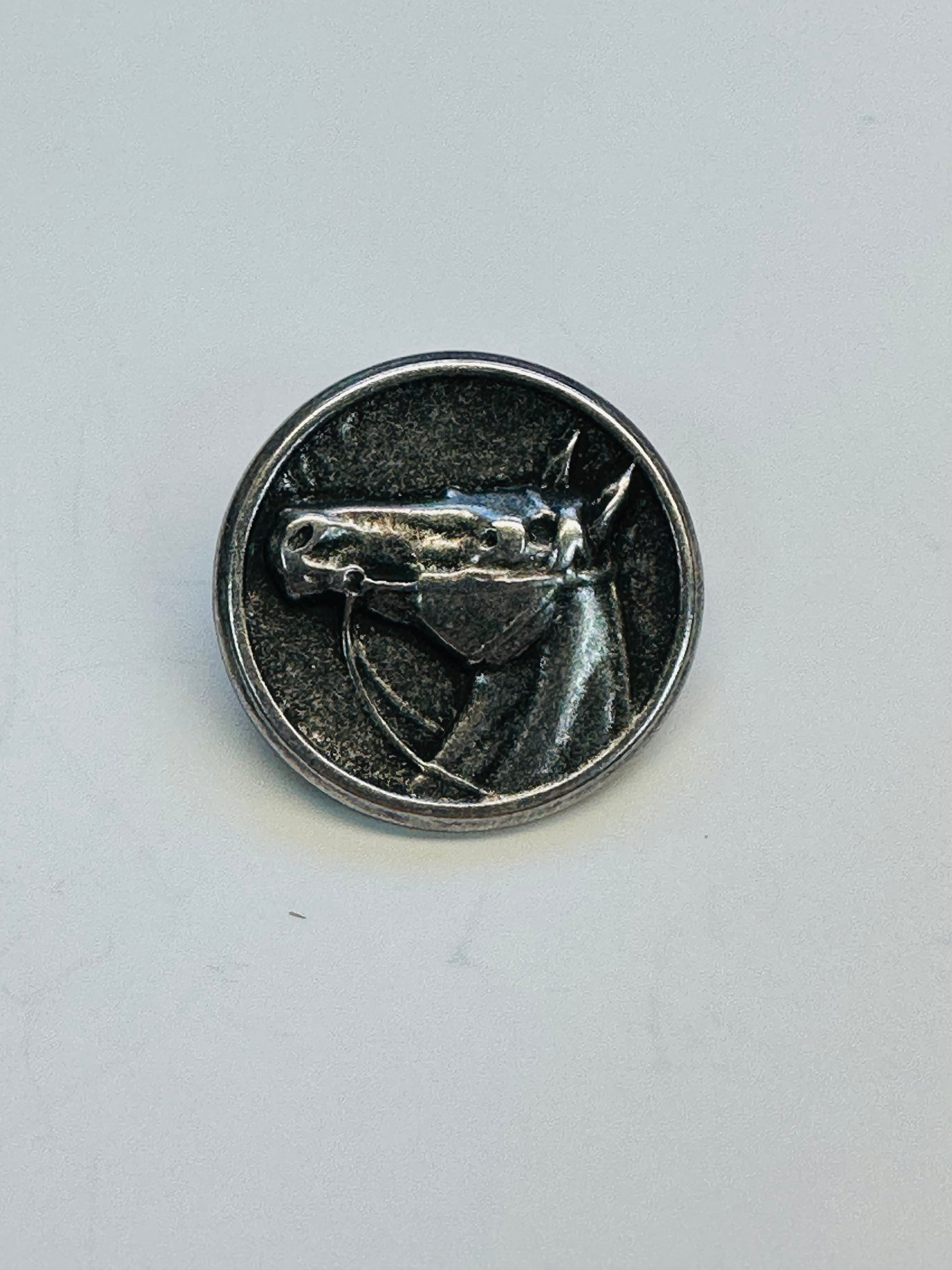 This smart 23mm silver-tone metal button features a finely detailed horse head design set within a smooth circular border. The sculpted horse profile has lovely depth and definition, with a lightly antiqued finish that gives it a confident, classic look. Finished with a shank back, it sits neatly on garments and accessories.
