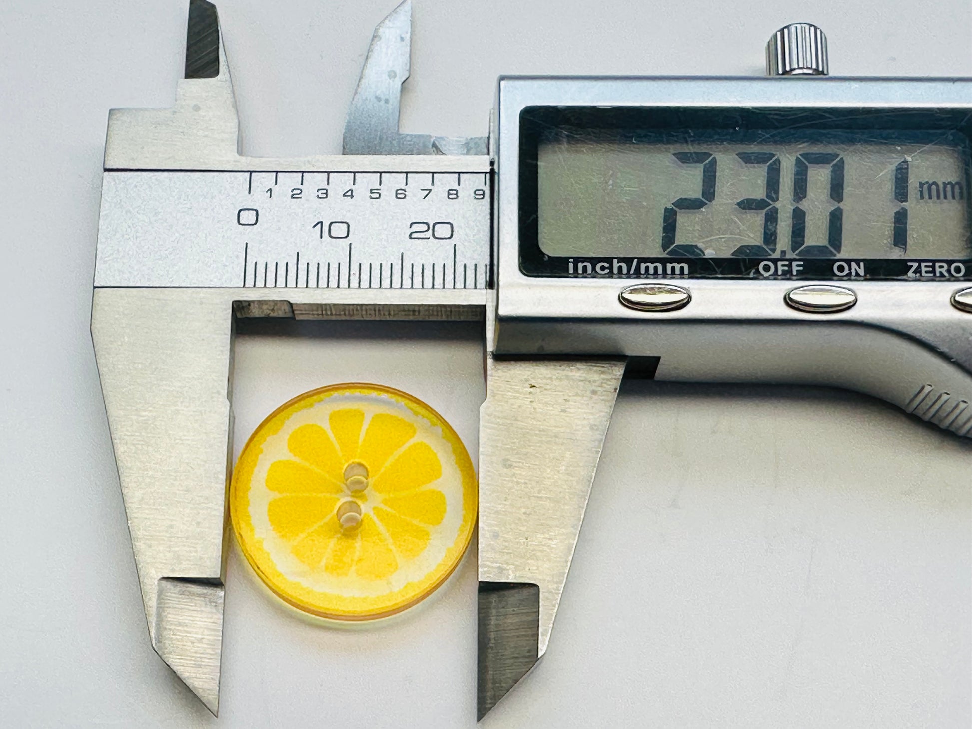 This cheerful 23mm lemon slice button features a bright yellow transparent design with layered citrus detailing that really stands out. With its glossy finish and playful look, it’s a gorgeous little accent that brings a fresh, summery feel to handmade projects.