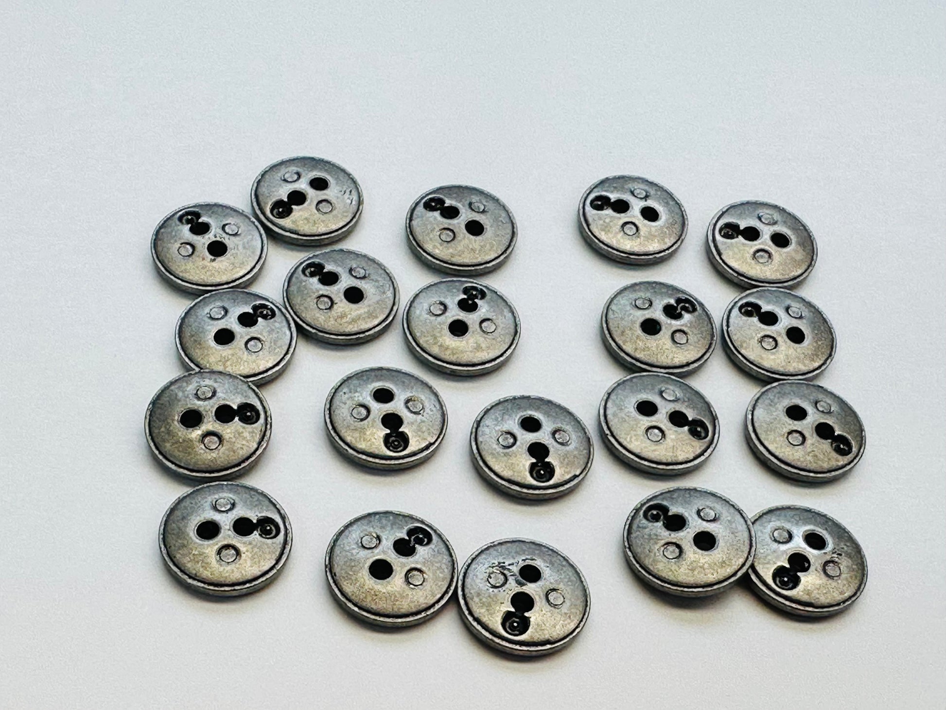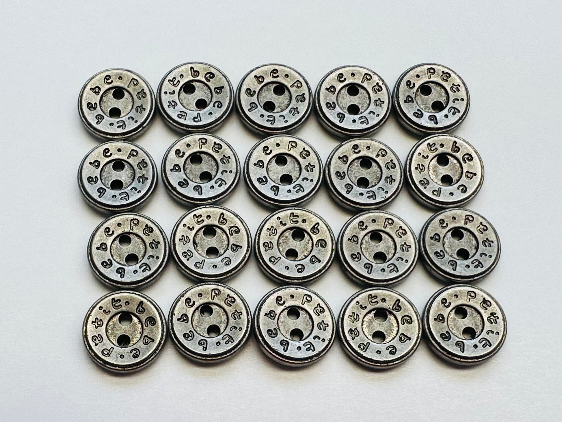 These stylish silver-effect buttons feature a subtle logo-style design around the edge, finished in a soft metallic-plastic with a lightly textured surface. The look is modern and understated rather than overly shiny, making them easy to pair with a wide range of fabrics. The two-hole sew-through fixing keeps the design clean and practical. Each button measures 13mm (20L / approx. 1/2 inch). The price is for a set of twenty buttons. Colours are for guidance as all screens vary.