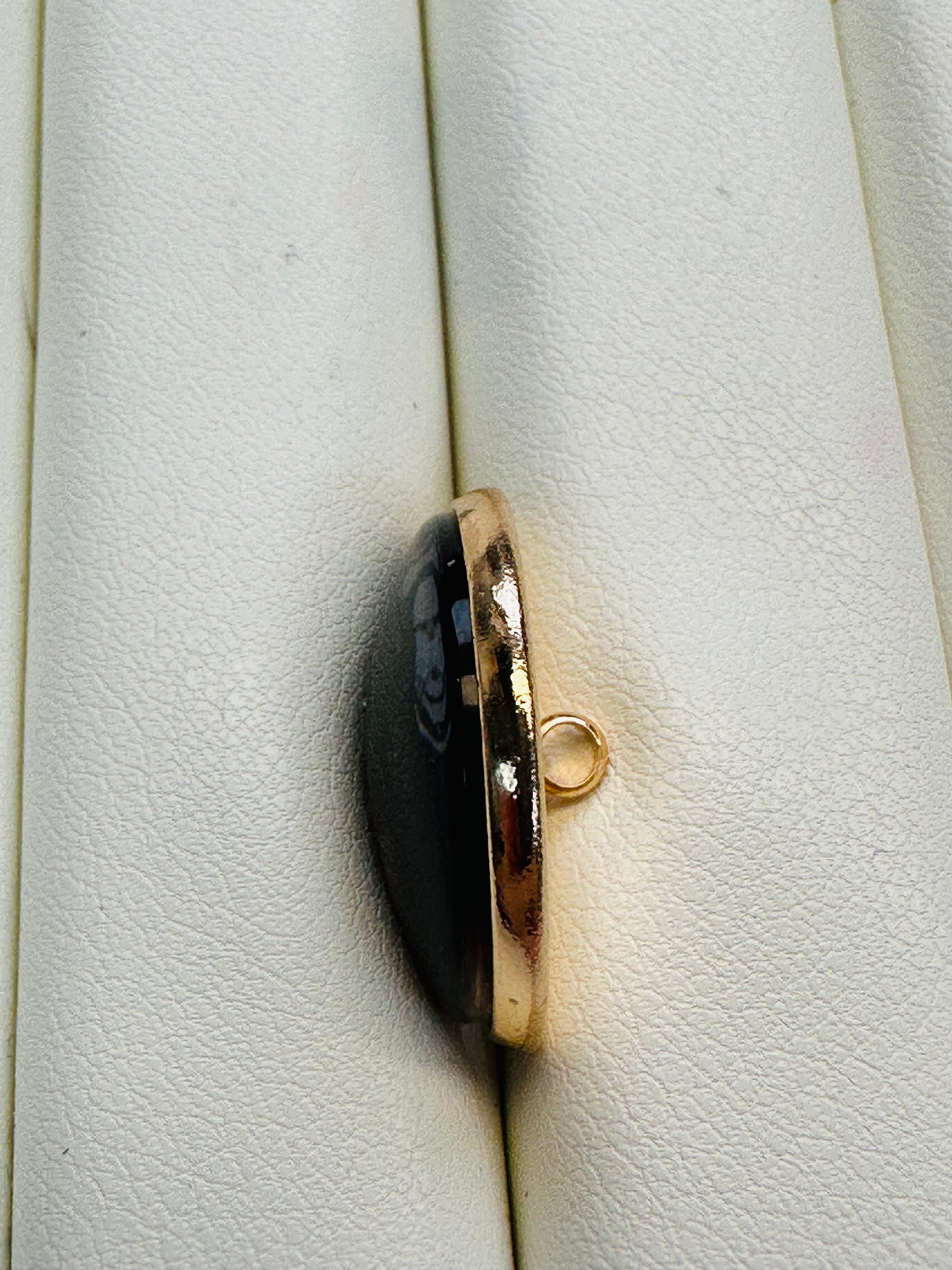 This beautiful 22mm button features a striking black cat design in a stained-glass style woodland scene, finished beneath smooth domed glass and framed in a gold-tone metal setting. The rich autumn colours and detailed artwork look especially eye-catching under the glossy glass finish. Finished with a shank back, it’s a gorgeous decorative button for standout projects.