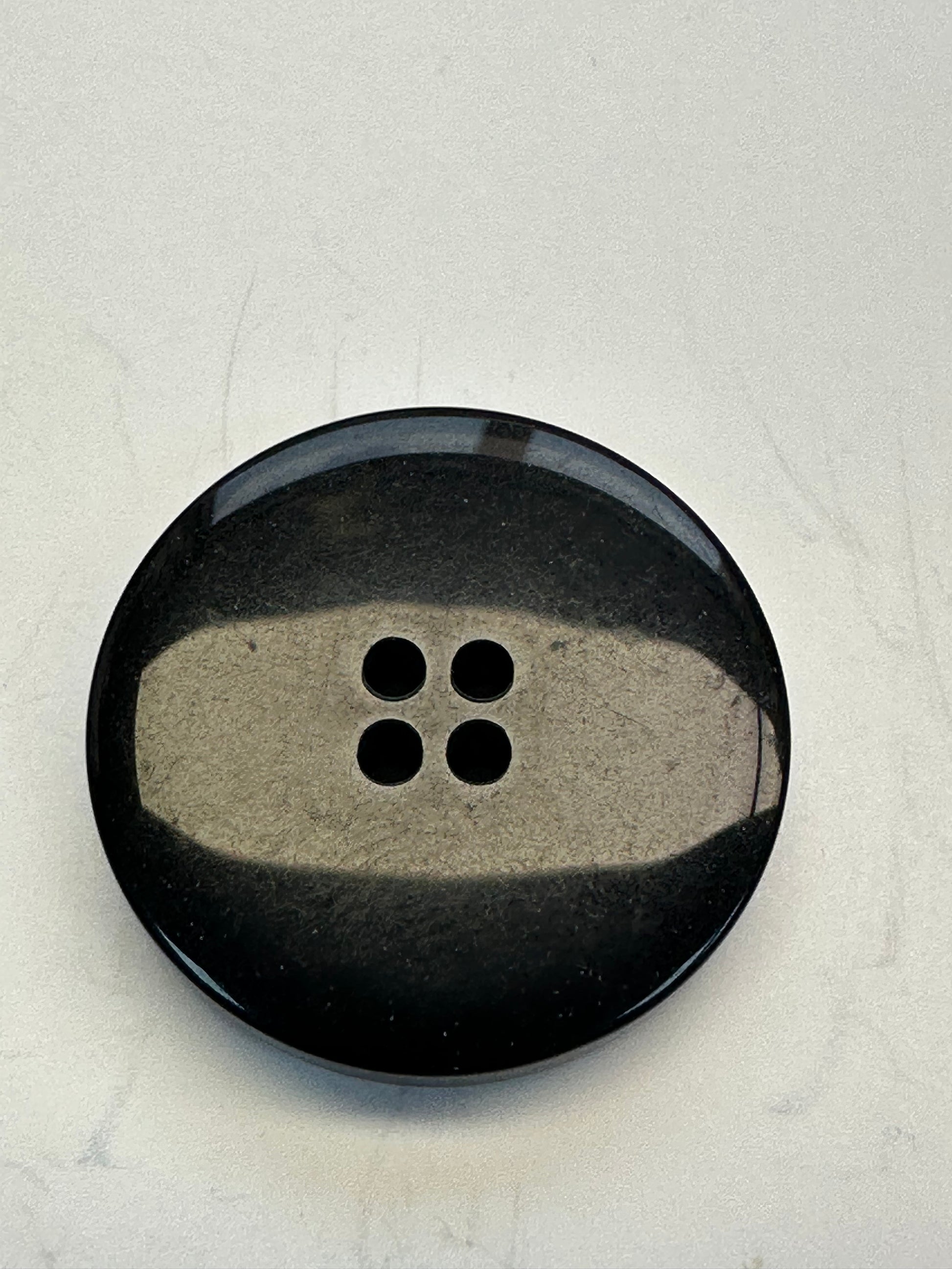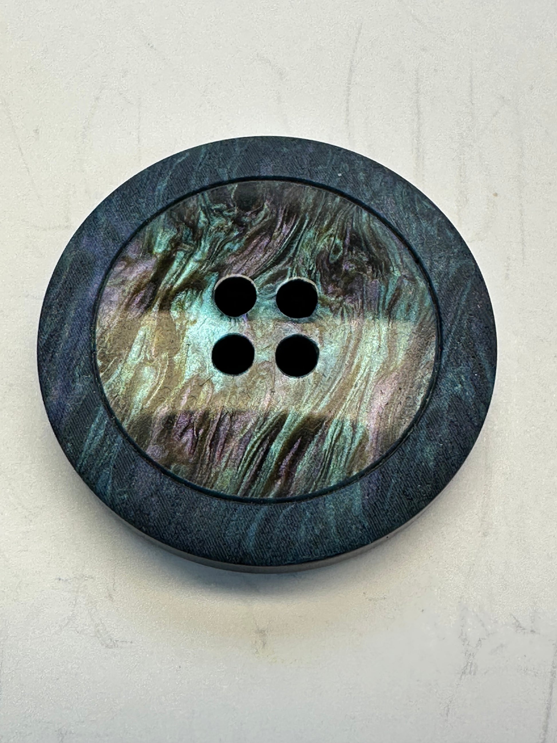 This beautiful 23mm button features layered blue, teal and green tones with a softly blended ombre effect and subtle woodgrain-style pattern. The darker outer rim frames the lighter centre beautifully, giving the button real depth and a tactile, considered look. Finished with a classic sew-through centre.