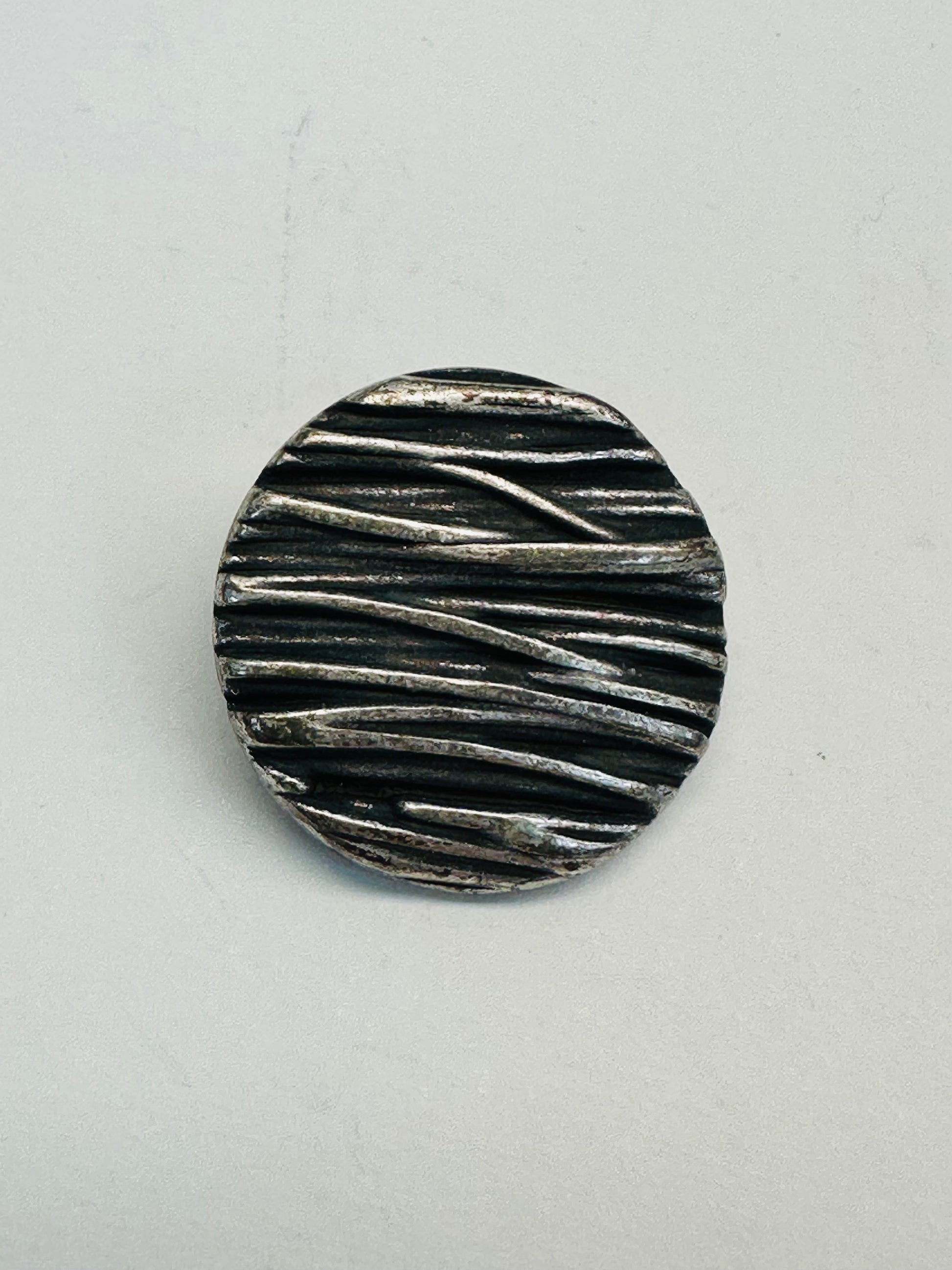 This silver-tone metal button features a striking textured surface with flowing, wave-like lines that give it a sculptural, tactile feel. The aged silver finish highlights the raised pattern beautifully, creating depth and movement across the surface. Finished with a shank back, the design sits neatly on garments and allows the texture to take centre stage.