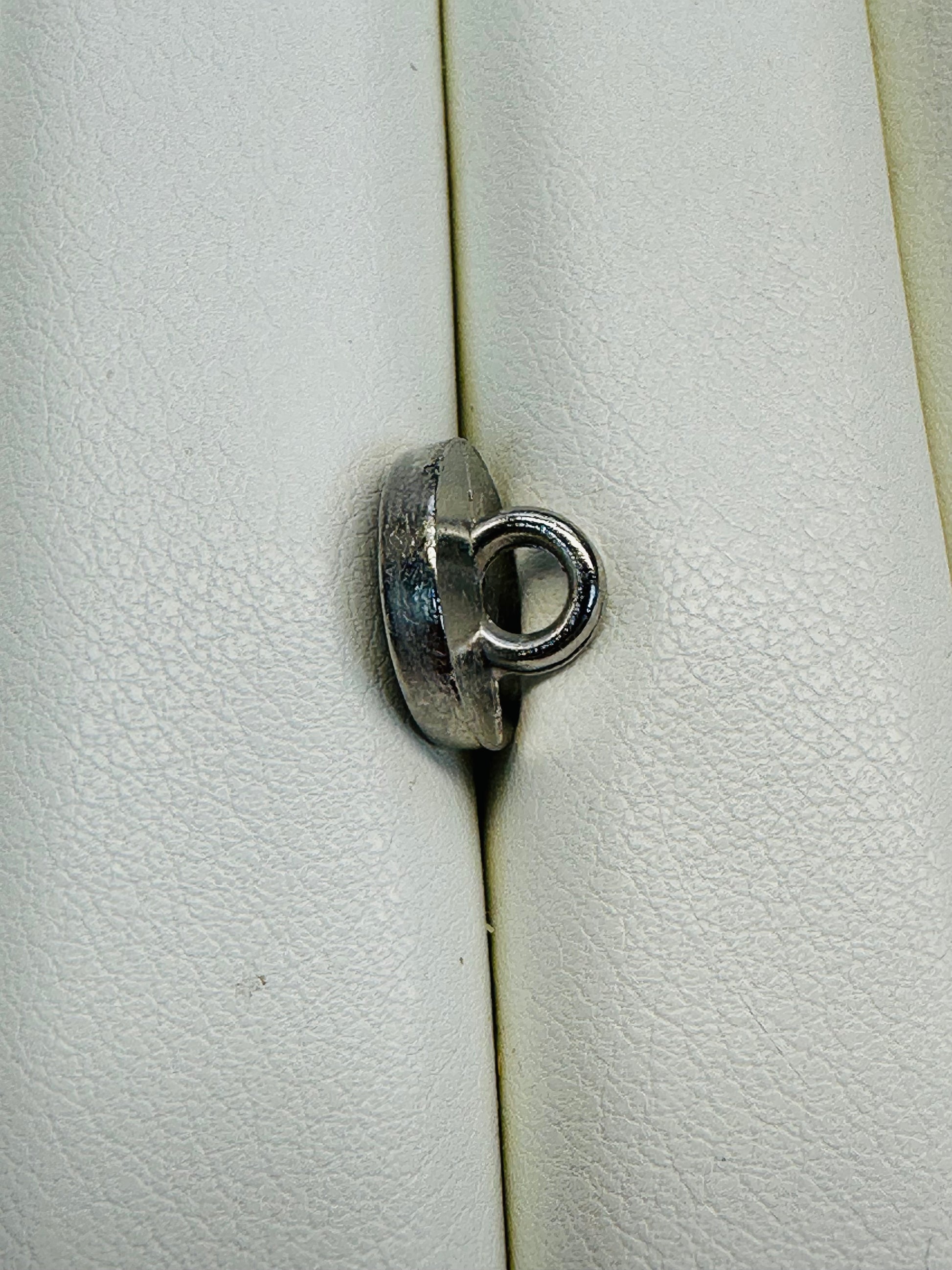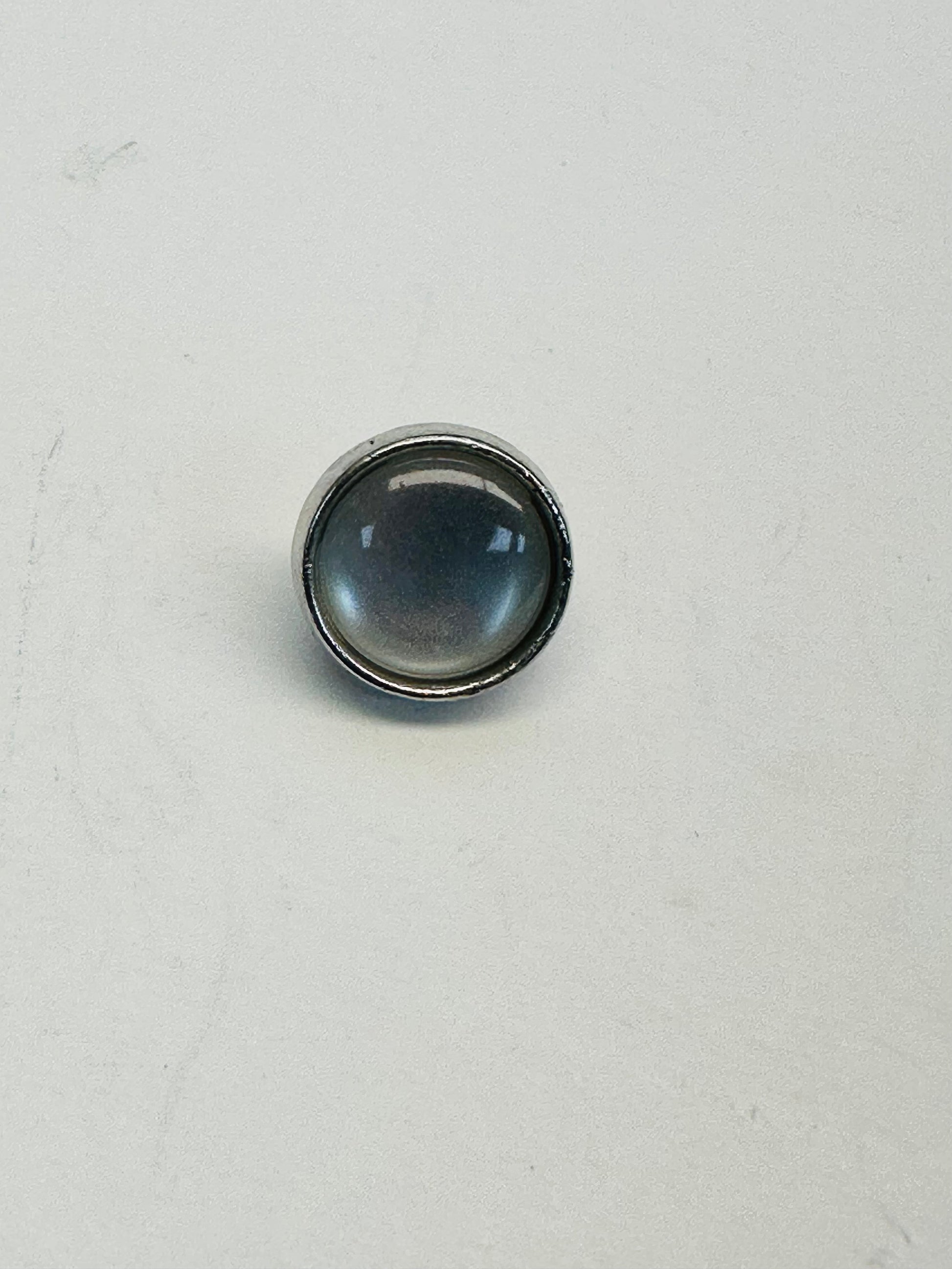 A beautiful white pearl button framed with a slim silver-tone metal border for a clean, polished look. The softly domed pearl centre has a gentle sheen, while the metal surround adds definition and contrast, giving these buttons a refined, jewellery-like finish in miniature.